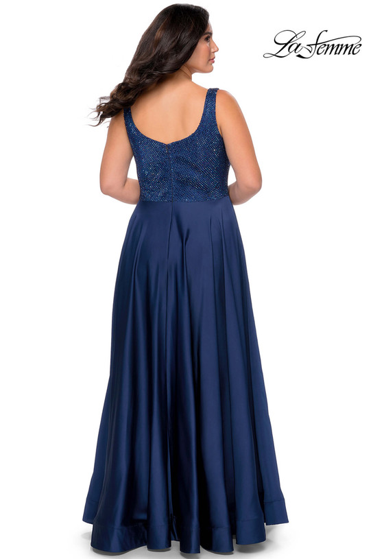 You are sure to captivate everyone in this charming plus size prom dress. The sleeveless dress offers a v-neck, rhinestone lace bodice, and satin full A-line skirt with a side leg slit and pockets. This dress is finished with a V-back.