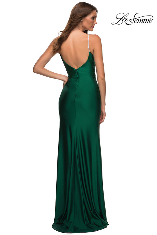 Goddess worthy v-neckline formal gown with ruched bodice. The hips and high slit accentuates your assets in all the right place. Feel sexy in this strappy open back jersey dress.