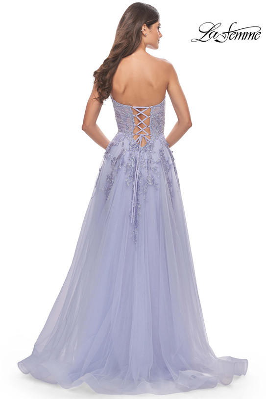 This elegant prom dress is perfect for your next special occasion. The bodice is made of lace that lines a strapless, sweetheart neckline. The lace is embellished with sparkling rhinestones for added shimmer. The skirt of the gown gathers on the waist to minimize your figure. This gown is the ultimate formalwear staple piece that will never go out of style.