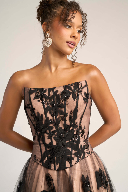 - Lace & Tulle Overlays: For a romantic look, many gowns feature delicate lace overlays on a nude or champagne base, creating a beautiful, multi-dimensional effect.