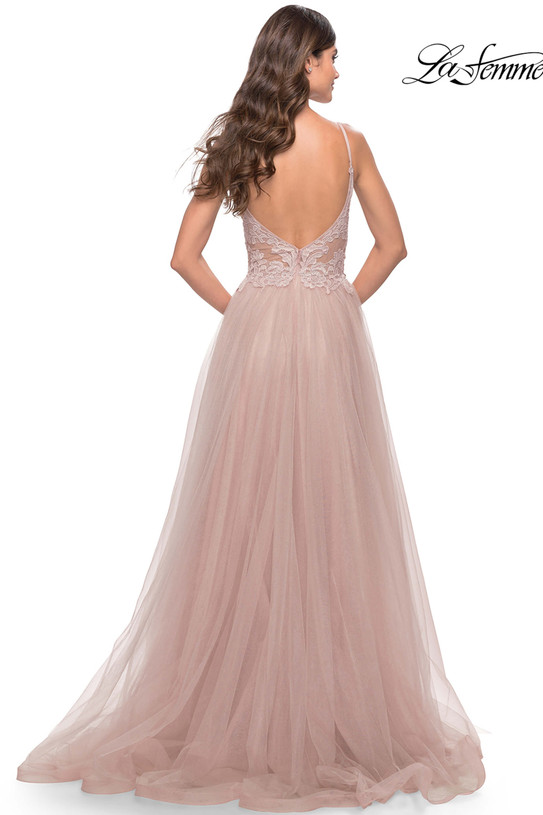 This gorgeous La Femme dress features a full lace overlay embellished with rhinestones for added sparkle. The stunning plunging neckline leads to a waist minimizing belt. The back of dress is lace up and fully open, allowing the fabric to hug you in all of the right places.