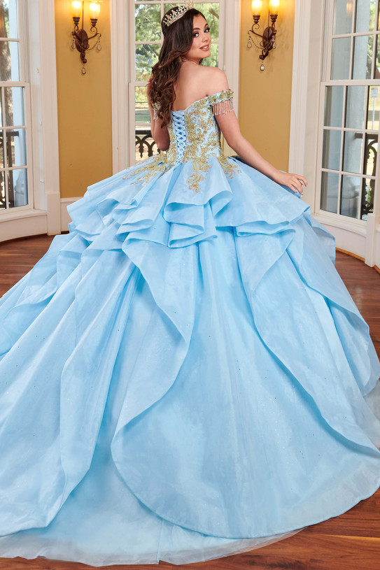 Dare to be royally different in this off the shoulder quinceanera dress with poufy sleeves. The top bodice has floral embroidery that is beaded embellished with a lace up back. The back of the dress is captivating with it detachable large bow and ribbon trim glitter tulle overlay cascading down the back.