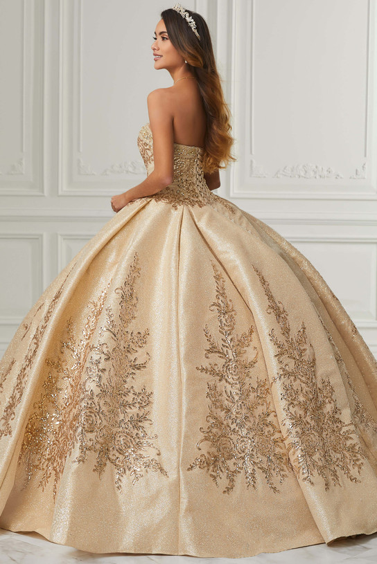 You will steal the scene of your fifteenth birthday party wearing this stunning quince dress. The sparkle tulle dress has a sweetheart neckline, fitted bodice adorned with glitter floral appliques, and ball gown skirt with double tulle floral hem. This dress is finished with a lace up back and train.