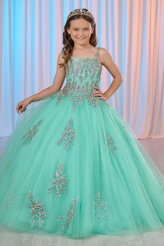 Celebrate your little star’s moment to shine. This classic ball gown pairs a richly beaded, square-neck bodice with a sparkle tulle skirt that glows under the lights—crafted for magical memories and grand entrances. Give her the confidence to shine on stage.