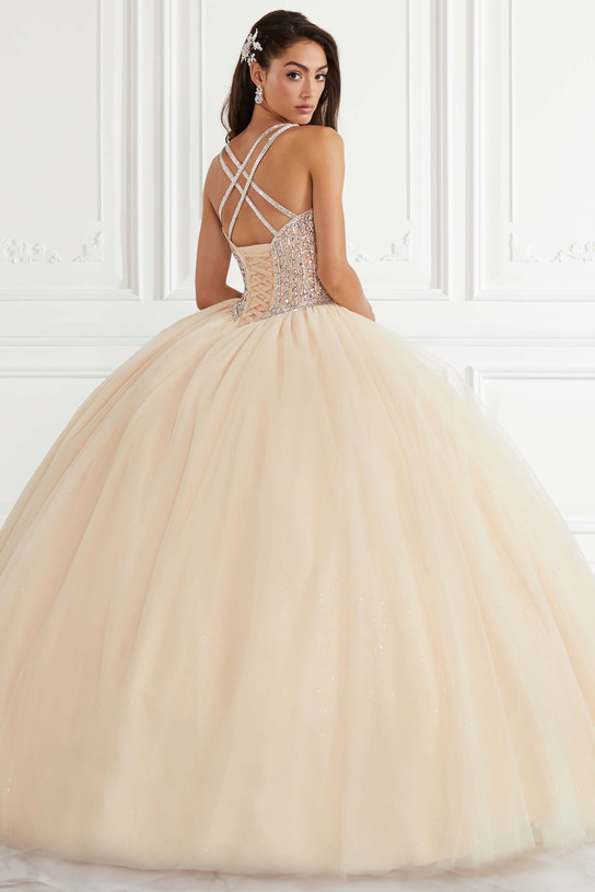 This stunning Quinceanera Collection 26927 dress will make you a princess at your fifteenth birthday party. The sleeveless dress offers a V-neckline, fitted bodice embellished with metallic lace appliques, and tiered ball gown skirt. This dress is finished with a cutout corset back.